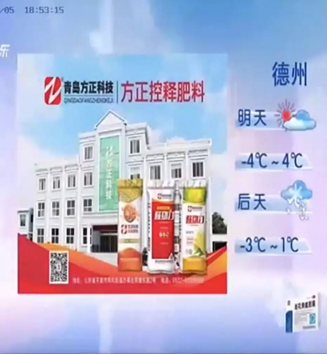 新年伊始,青島中天集團旗下方正品牌攜肥料和農(nóng)機亮相山東衛(wèi)視電視預(yù)報標(biāo)版德州正副版,給山東的父老鄉(xiāng)親帶了一陣暖暖的中國紅。