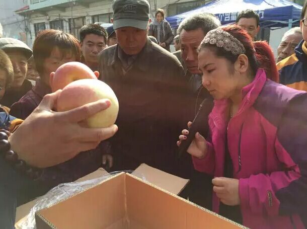 李大哥手拿自家的大蘋果,向大家介紹自己的種植經驗和種植技術,并還向現場的朋友們發起挑戰 ”誰的蘋果比我大,我請他吃飯“!
